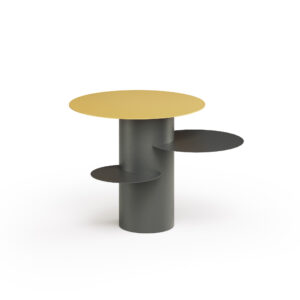 NOTE: VENTAGLIO è il tavolino in metallo caratterizzato da due piani che ruotano intorno al piede che fa da perno. Questo dettaglio permette di aprirlo e trasformarlo proprio come un ventaglio. Dallo stile giocoso e dinamico, il piano superiore è disponibile in grafite, mentre quello inferiore è personalizzabile nelle tre colorazioni (Viola: RAL 4009, Giallo: RAL 1005, Terracotta: RAL 8004).